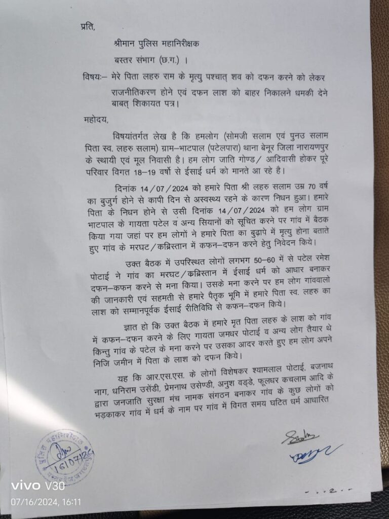 नारायणपुर जिले में धर्म की लड़ाई थम नही रही है , पिछले साल भातपाल से ही 20 अक्टूबर 2023 से ईसाई धर्म पर विश्वास करने वाले परिवार के मृत शरीर को दफन को लेकर बवाल हो गया था, बाद में इसका बड़ा विरोध होकर नारायणपुर जिले में दंगा होने लगा। तब माना जा रहा था कि यह सब चुनावी माहौल के कारण राजनीतिक फायदा उठाने के लिए किया जा रहा है । पर अब पुनः इस माह  की 14 जुलाई को लहारू सलाम पिता नोहरू सलाम 70 वर्षीय बुजुर्ग पुरुष की अपनी ही जमीन में दफन की गई लाश निकलने की कोशिश को लेकर बवाल हो गया है । पता चला है कि जन जाति सुरक्षा मंच के सदस्यों द्वारा दफनाया हुआ लाश को निकलने का प्रयास किया गया ।
