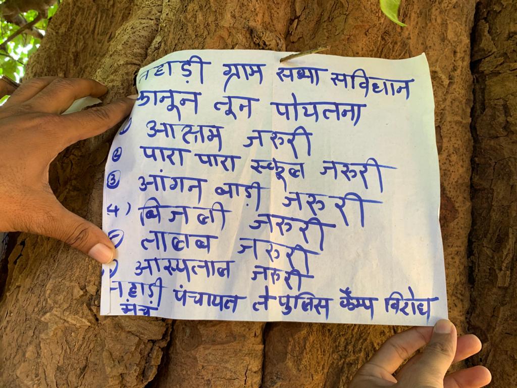 “हमें स्कूल, आंगनबाड़ी, स्वास्थ केंद्र, पानी, बिजली जैसी सुविधा चाहिये, हमारी ये समस्या दूर करें । हमें कैम्प नहीं चाहिये । हमारी निजी जमीनों में जवान जबरदस्ती कैम्प खोल रही है इसका विरोध करते हैं”